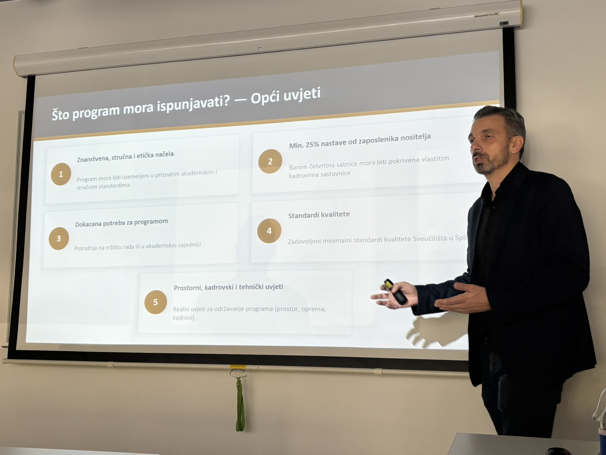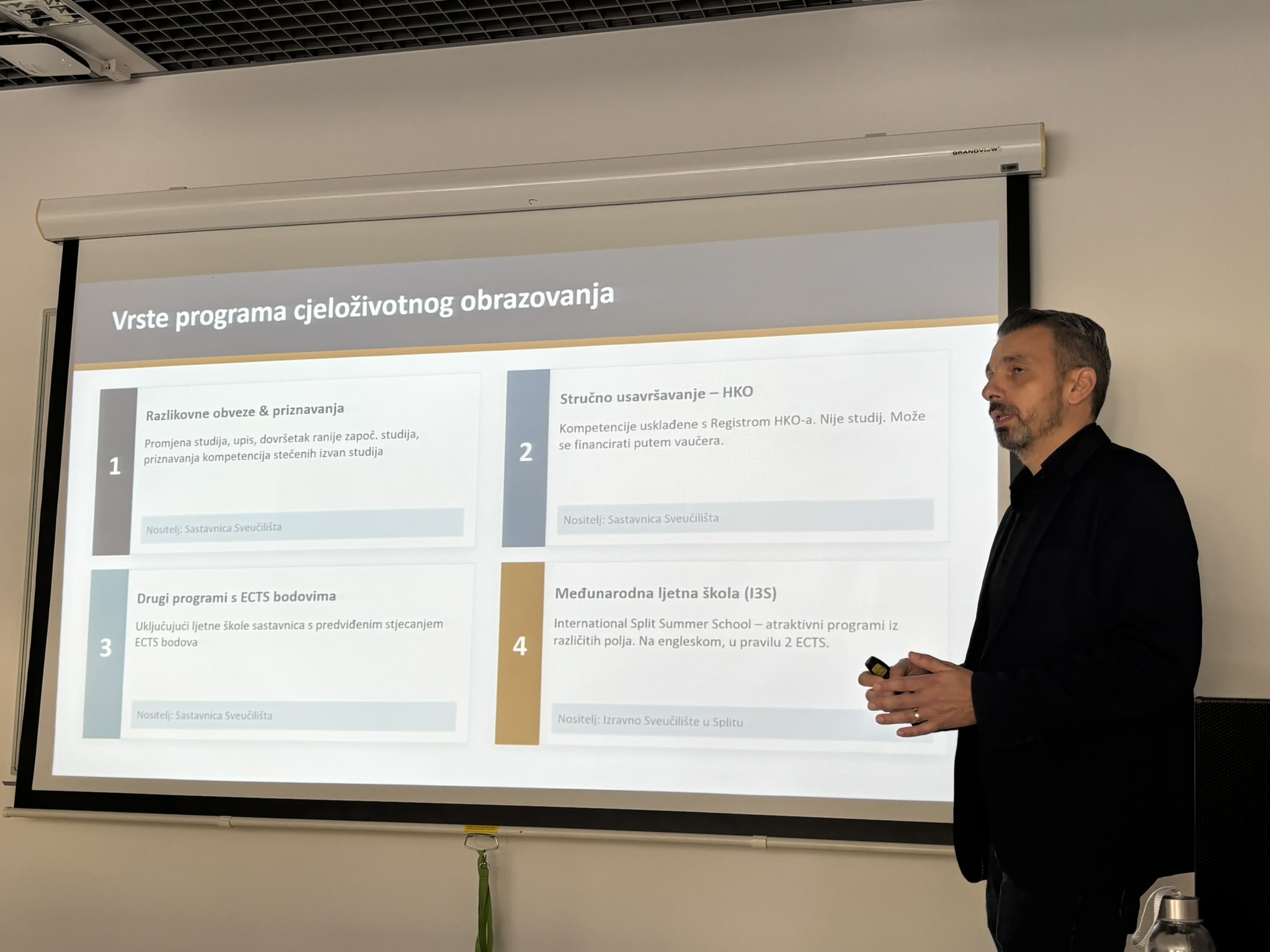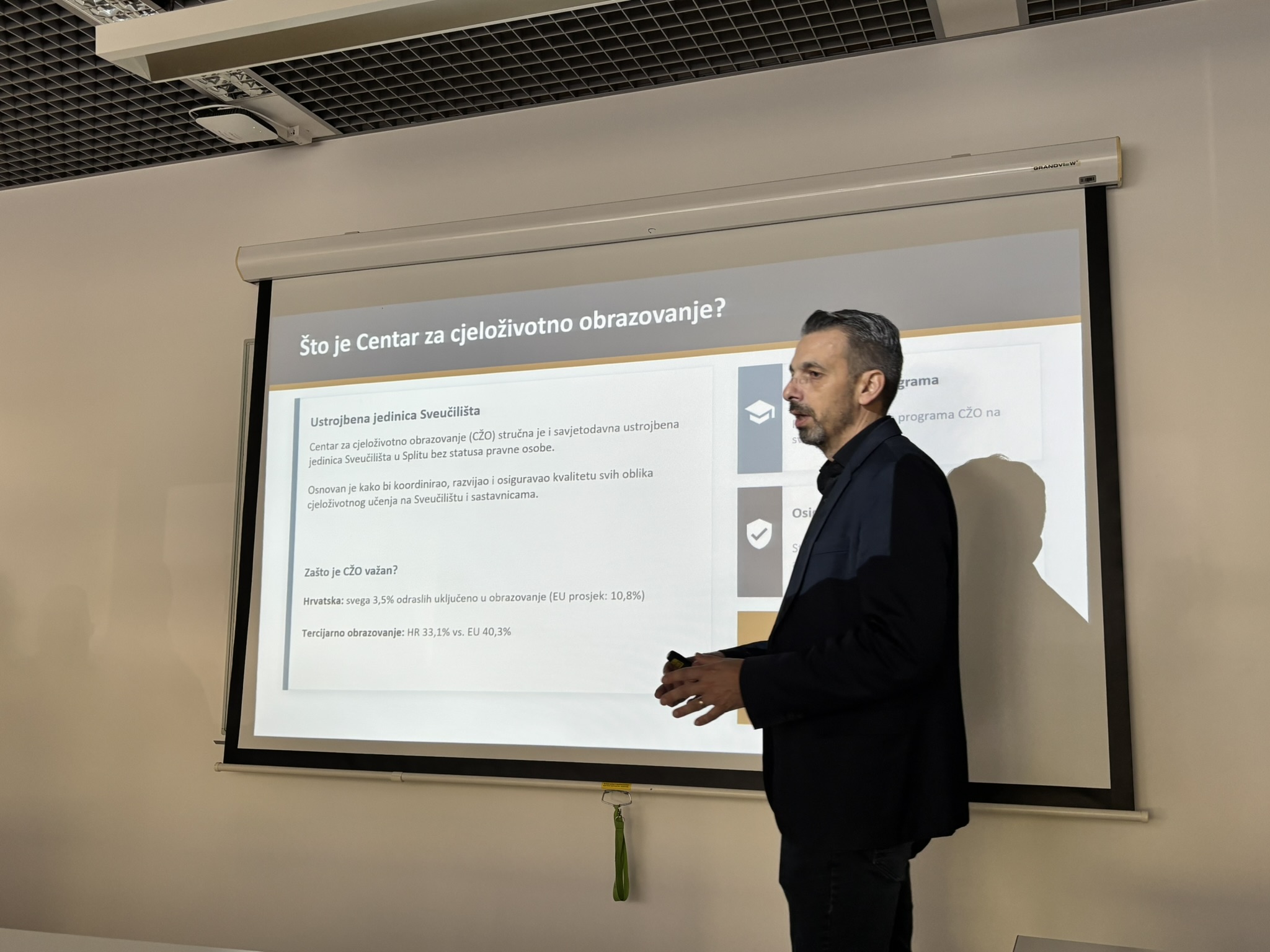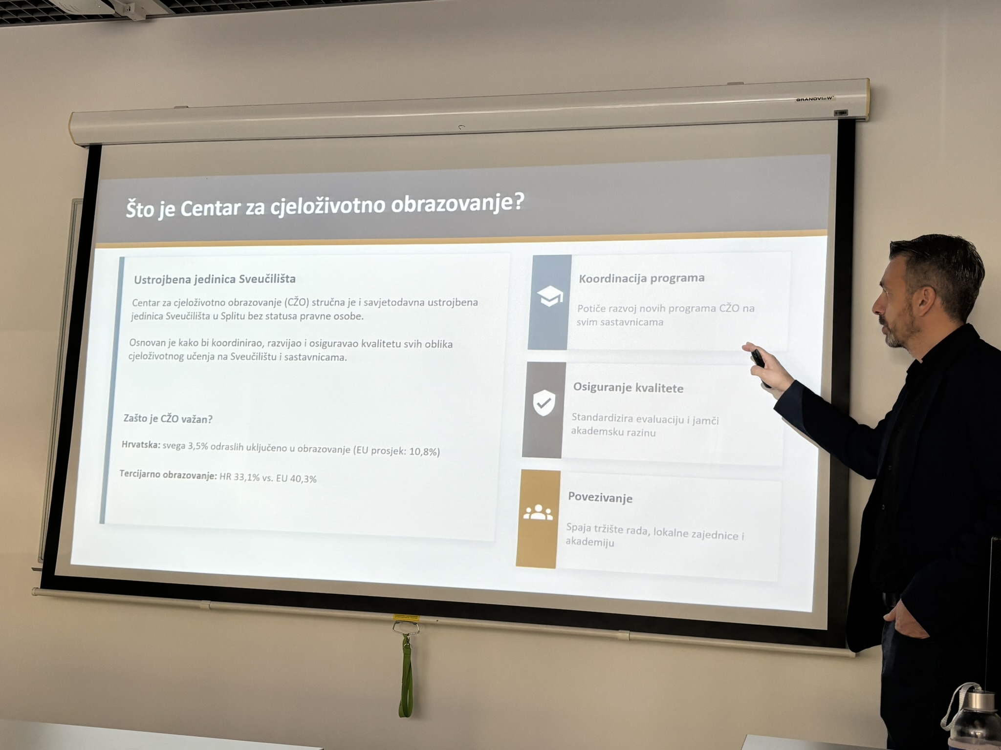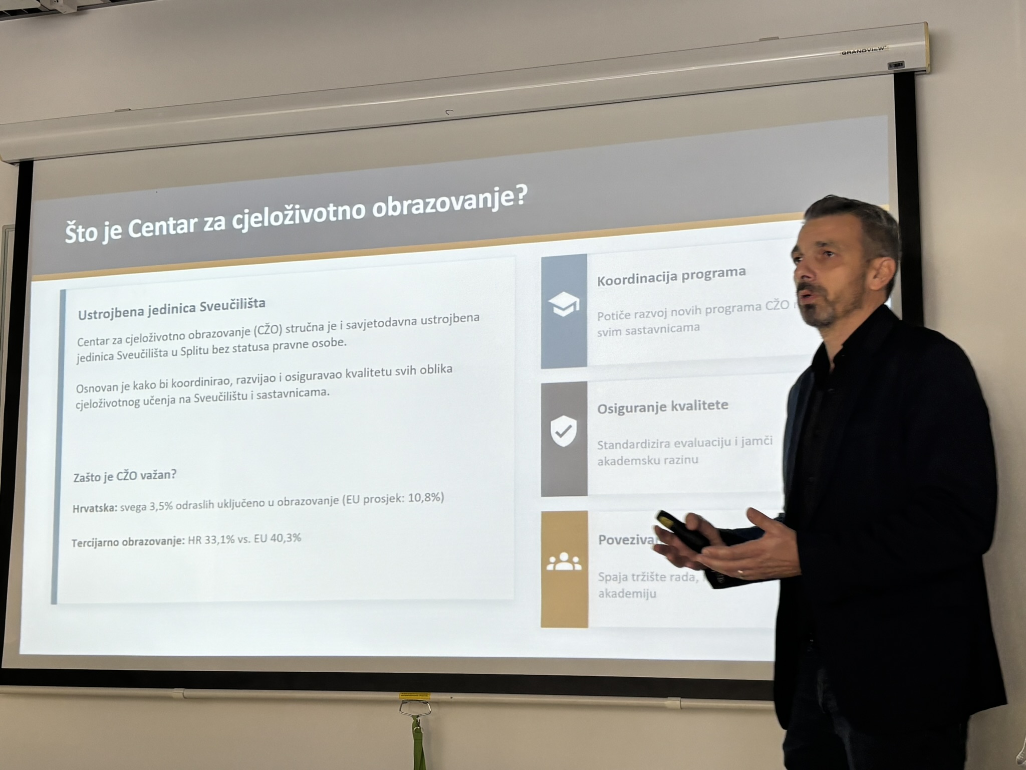 Predavanjem su obuhvaćene ključne teme normativnog i programskog okvira CŽO-a na Sveučilištu u Splitu: četiri kategorije programa koje koordinira Centar (razlikovne obveze, programi stručnog usavršavanja usklađeni s Hrvatskim kvalifikacijskim okvirom, programi s ECTS bodovima te Međunarodna ljetna škola – I3S), postupak vrednovanja programa, te uloga Hrvatskog kvalifikacijskog okvira (HKO) u razvoju novih obrazovnih programa usmjerenih na potrebe tržišta rada.