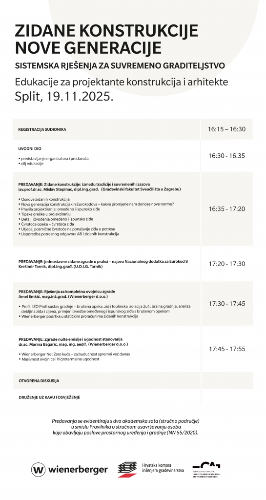 pozivamo Vas na predavanje Zidane konstrukcija nove generacije koje će se održati u Splitu, u srijedu 19.11.2025. godine s početkom u 16,30 sati. Fakultet građevinarstva, arhitekture i geodezije, Split.
